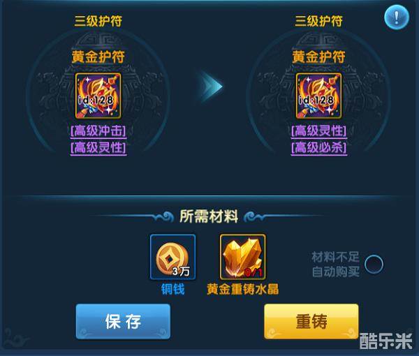 护符可以靠合成来改变护符拥有的技能数量。例如:2个1技能的黄金护符,有几率可合成2个高级技能护符。