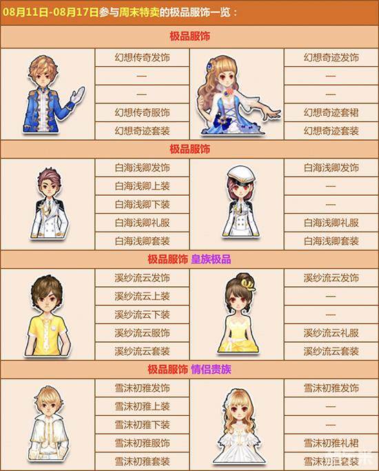 邂逅浪漫夏夜,唯美套装特卖降临!8月11日-17日期间,唯美极品【海的女儿/巴洛克风情套装】、【白海浅卿套装】、【幻想奇迹套装】、【金辉星警套装】等限时出售,手快有,手慢无哦!