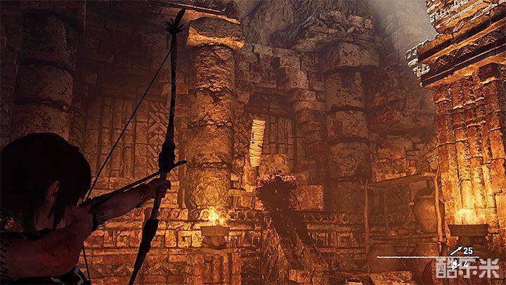首先找到带有绳索线圈的杠杆(上图)。用弓瞄准它,并用绳子箭头射击。Lara将能够拉动杠杆并使其到出易燃物质,这些物质会在路障前积聚在一个容器中。