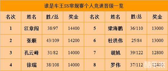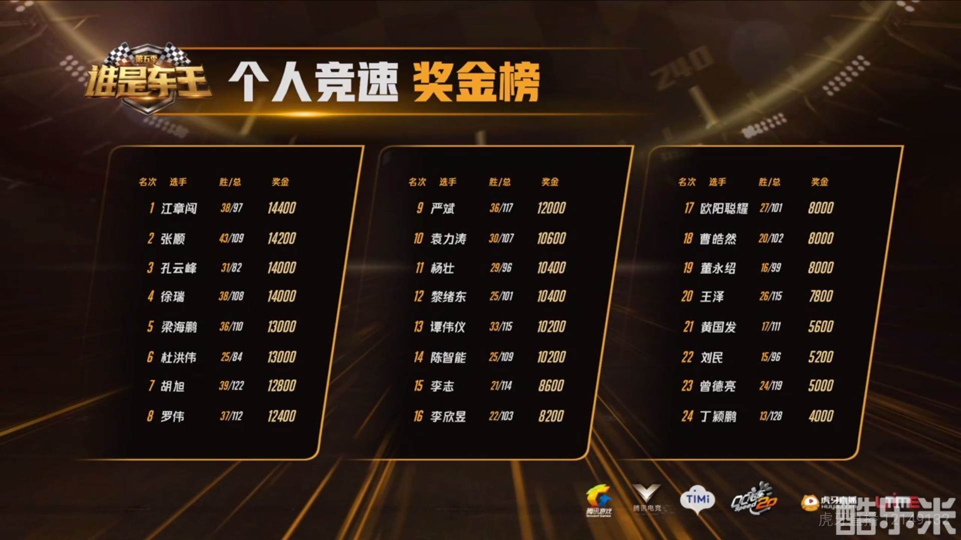 江章闯以14400的总奖金数位居榜首,张顺、孔云峰分列第二、三名,徐瑞与孔云峰同积14000奖金,对比胜率后位居第四。梁海鹏与杜洪伟分列第五第六,胡旭位列第七,罗伟名列第八。