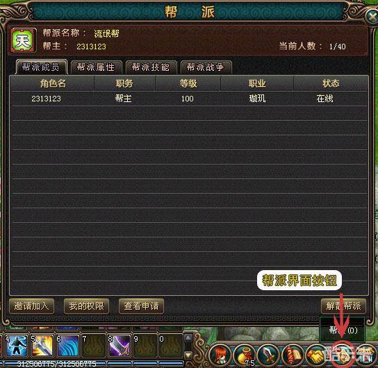 4、点击创建按钮,系统判断帮派名字未重名且合法后,申请通过,扣除玩家100金币的建立帮派资金,帮派成立,您可通过游戏窗口右下角的帮派按钮打开帮派面板。(注:帮派七天内未达到8名成员,则会被系统自动解散。)