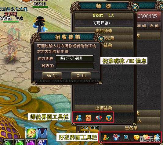 2、在弹出的招徒面板中,你可通过输入对方昵称或者角色ID向对方发出收徒申请。(注:无法招收等级高于25级的玩家为徒。)