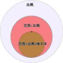 这张图,大致描述了血锤的伤害状态,中心的红点表示,被击中的怪物,此刻正处于血锤伤害范围的边缘。为了让大家看到,锤子,范围伤害,血溅伤害大致是如何分布的。