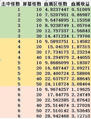 从表中我们只能看出血溅收益是随击中怪数和屏幕怪数逐渐提升的,这结论无疑是正确的不过地球人都知道。为得到更直观的结论,我们按血溅收益大小来分类可以得到表3:
