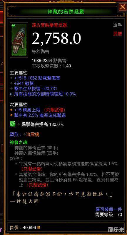 最后还是强调一点,拳法作为最灵活的流派,上手易,精通难,需要你对武僧有深刻的理解,配装什么的,没有固定,只有你根据实战情况不停调整,找到最适合你的一种,上面Gary过70层的这种配装调整,不见得适合每个人,但是这是一种有用的思路,一种在高层如何平衡输出和ehp,攻速,cdr之间关系的有用尝试,希望上面的总结能起到抛玉引玉的作用。