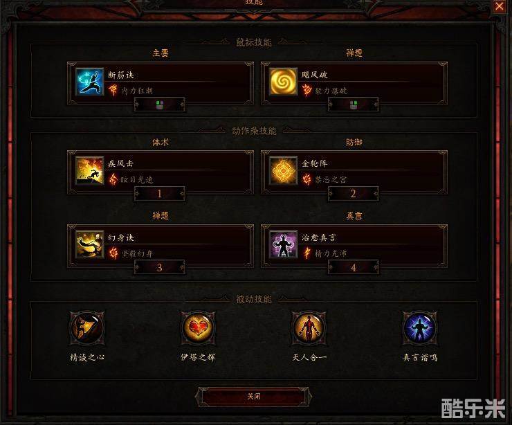 主动技能,飓风破,金轮阵,治愈真言,幻身决,这4个基本上是必带没有什么争议的。