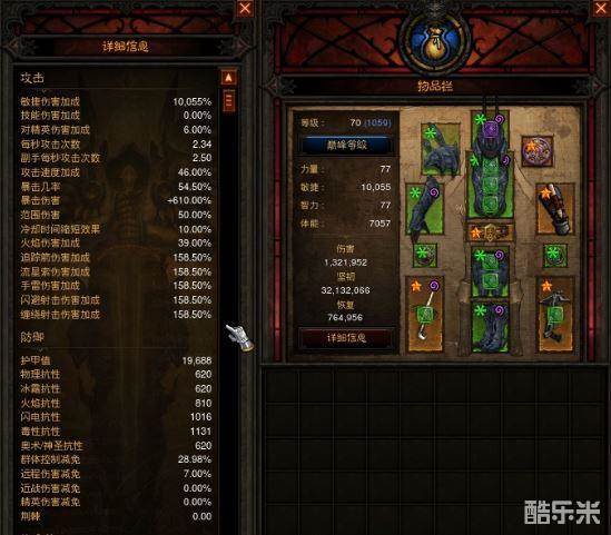 为了追求输出楼主选用了火枪和灾劫双持,但是楼主并没有极品地狱火所以选择了双暴攻速的奥免项链感觉也是个不错的选择,技能方面参照各位大神选择了箭塔和麻痹陷阱组合,然后采纳另一位朋友的暗影游移和烟雾弥漫组合保证生存和走位,但是选择了手弩双持爆伤超高,于是被动选择了箭术高超。宝石方面按照近战打法推荐使用了增痛宝石,不过楼主看到扫射技能就想到了娜套的打法,那么我们可不可以放弃增痛宝石选择太极呢,脑洞了一下可行性很高,既保证了输出又提供了强大的生存,于是选择困者、太极、至简宝石投入实战,很快楼主遇到了新的问题,首先太极的效果是值得肯定的,但是在高强度的作战中必须要保证一定的节奏才能保证不缺少憎恨,没错因为要经常扫射和释放箭塔导致了憎恨的大量消耗,那么是不是要适当的保留几条减耗词缀呢需要各位朋友帮忙实践。(PS:楼主衣服不是最优属性保留了一条回憎属性并且箭术高超被动有回憎,在调整了一番节奏后可以勉强保证憎恨的平衡)。