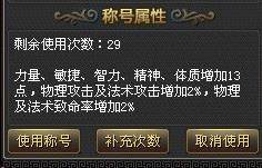 3.奇门大多数称号都是有使用次数限制的,国家官员的称号不受次数限制.若使用次数完了,玩可以在称号界面点击“补充次数”.
