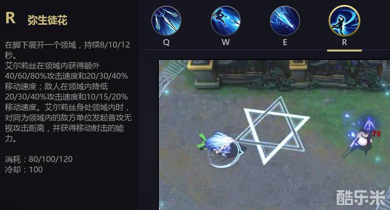 一级学E二级升Q。搭配能一起poke的辅助,推线权会一直掌握在手中。E技能能够给第四下普攻增加额外的魔法伤害并且减速敌人,是艾尔莉丝这个依赖平A打伤害的英雄很重要的技能。
