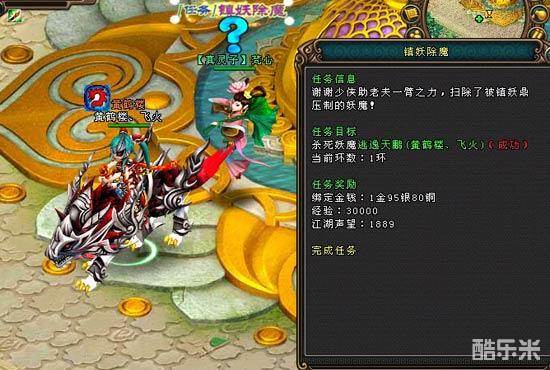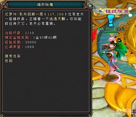 1、接收任务:等级达到35级的玩家可以在流NPC【真灵子】梵心处领取【镇妖除魔】任务,每天每个角色可完成10环任务,完成第10环镇妖除魔任务.