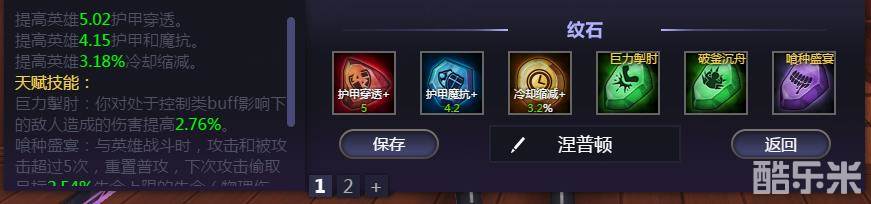 首先来看看纹石搭配,红色纹石选择固定物穿,物穿对于涅普顿来说收益比较高,蓝色纹石我一般会选择双抗或是魔抗,这个影响不是很大。