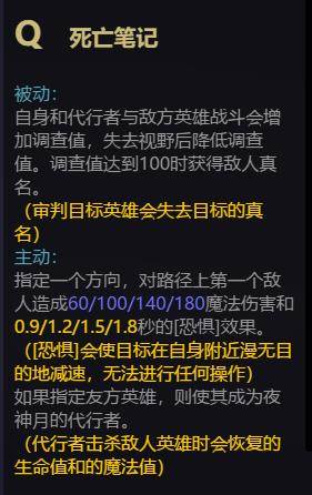 初期主E,Q和W对点。Q技能指定的代行者击杀敌人时会给夜神月带来助攻(但是被击杀的英雄是在不获得真名的情况下)。