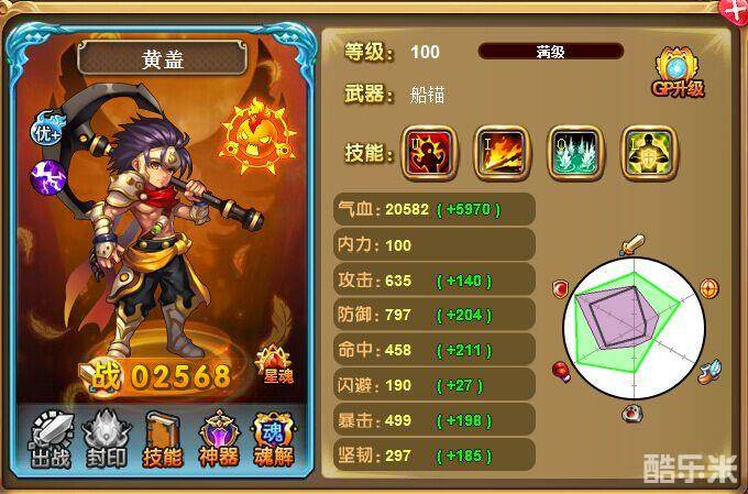 可以看出黄盖的气血、防御和暴击较突出,气血仅次于乐进排名第二,而防御则是第一,相信大神完全可以突破800。我要强调的是 他的攻击和命中都很高!