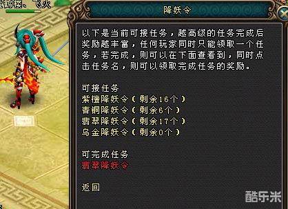等级达到25级的玩家每天可以领取“降妖令”任务,杀死对应等级的怪物,即可完成任务。
