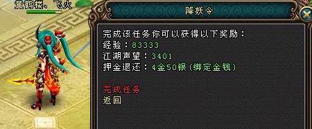 完成任务:玩家按照任务需求在限定的时间内消灭降妖的怪物,需回到【降妖使者】处交付任务,并返回押金。