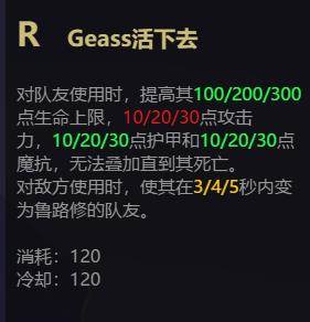 一级出门可以学E技能在前期对线上对队友的技能有一个加成的效果。鲁路修的W技能是在队友击杀单位时,被动是跳钱,这使得鲁路修本身的经济收入不低。