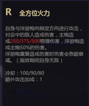 在使用R技能时,如果不是光束枪模式,强袭自由的AOE伤害范围会横向扩大,主炮的物理伤害最高,浮游炮威力依旧存在。此期间强袭自由无敌状态。