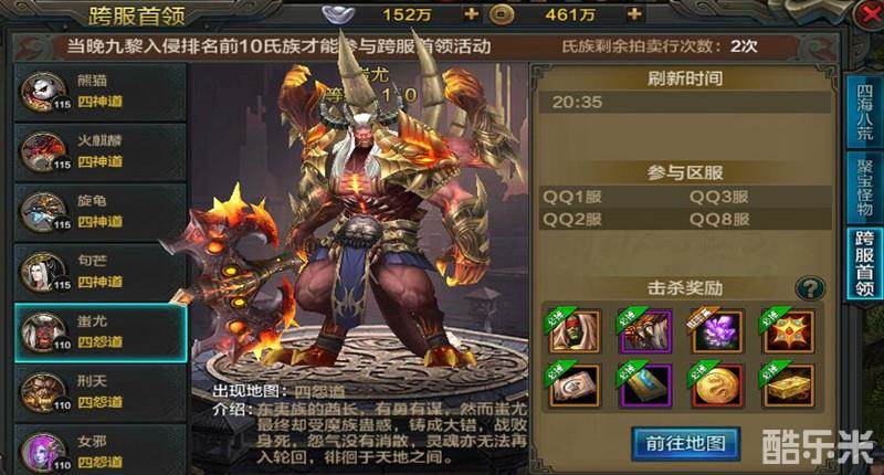 在四怨道地图内通过击杀蚩尤BOSS,将会获得天尊魂珠、首领猎手称号、九锡晶元、强效技能书等大量奖励。作为跨服首领的特色玩法之一,不同实力的氏族可以根据自己的情况挑战不同的BOSS。蚩尤现世期间,诸位华夏勇士若没有成功将他击败,那么蚩尤将继续隐匿,积蓄力量,再现华夏大陆。