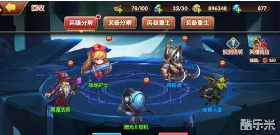 玩家可以把英雄替换下来的低品质装备拿来分解。分解装备可以返还大量威名及100%的养成资源。威名可以在神装商店兑换装备碎片。
