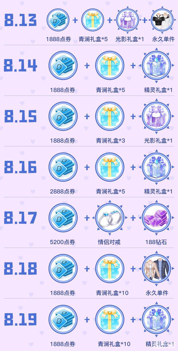 浪漫新版本期间,每日登录游戏领取点券、礼盒,更有单件和钻石免费拿!!