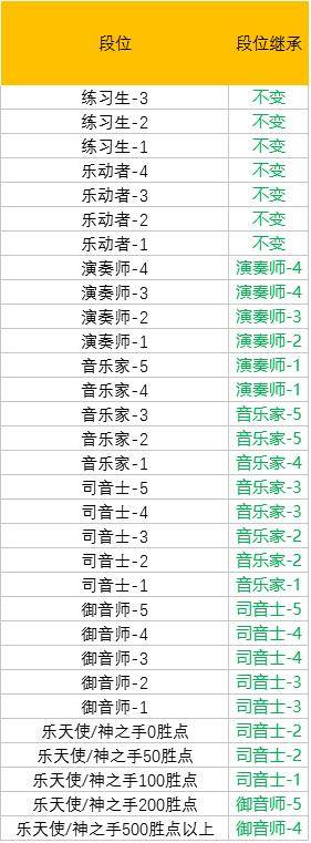 关心新赛季的初始段位?别担心,新赛季的段位会根据上赛季结束时的段位进行继承重置,你的努力不会白费!具体段位变更情况如下: