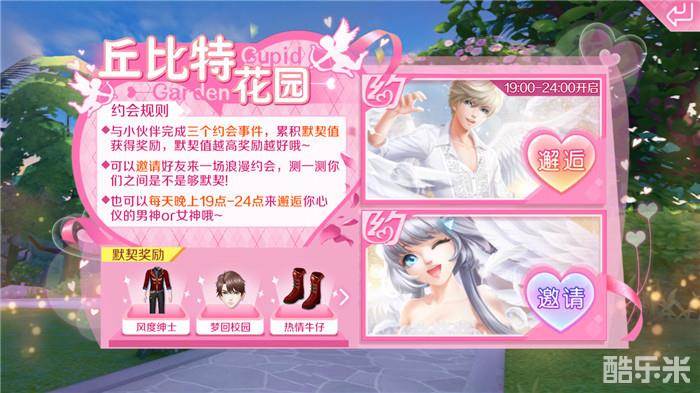 约会玩法在8月2日至8月19日期间开放,在活动期间玩家进入QQ炫舞手游主页面后,可以看到“丘比特花园”地图。在进入丘比特花园后,大家可以进行浪漫约会玩法。浪漫约会可以有两种方式,第一种可以在每天19点至24点开启邂逅方式,玩家在开放时间内选择邂逅,系统会随机为你选择一位可以约会的对象,当双方同意后可以进行约会。