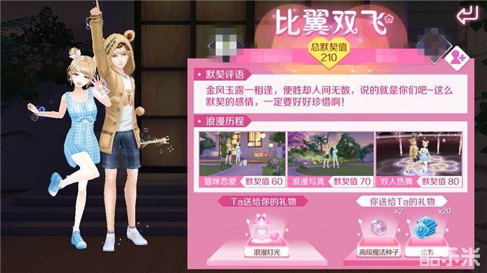 约会事件也是非常容易完成的,有爱情碎片:双方找齐20个爱情碎片;双人热舞:双方完成一支舞蹈,根据总分判定默契度;浪漫写真:双方根据规定的动作摆出Pose拍照;猫咪恋爱:帮助小公猫找到小母猫等。在三个约会事件完成后,系统会根据双方的约会默契值进行发放礼物,约会双方的默契值越高,礼物的价值也会越高。
