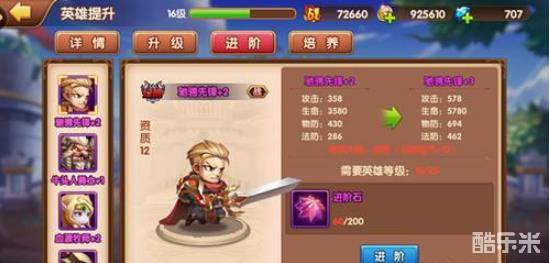 进阶:通过消耗进阶石,可以将满足等级条件的英雄进阶,高阶英雄的进阶还需要消耗同名英雄;进阶可以大幅度提升英雄的基础属性,同时还会为英雄提供进阶属性。
