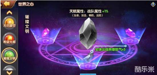 通过收集世界之心碎片,不断完善世界之心,为出战英雄提供更高的属性加成。