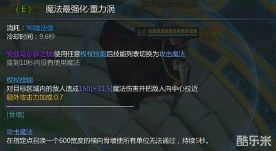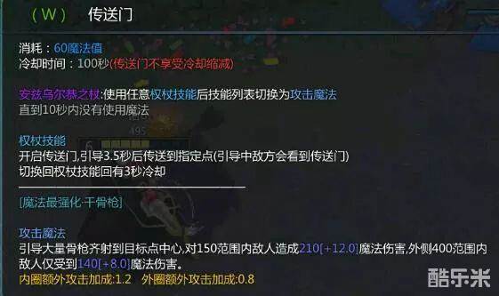 Q技能,光辉绿玉/魔法最强化 现断权杖状态下触发0.2秒无敌,每级递加0.2秒(以前是1秒无敌已经砍过了) 持续时间3秒攻击状态下对前方发出一道斩击 附带减速这是骨头对线期最关键的技能,无敌加墙的combo能够在很多时候让这个脆弱的法师逃离绝境。