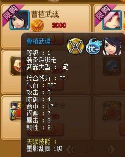 神将世界曹植武魂重磅回归,中秋活动期间,只要制作3000个熟月饼就可以兑换获得神将世界曹植武魂哦。小编特别提醒:兑换获得的曹植武魂是优加的哦。顺便说下,曹植的天赋技能就是墨影乱舞哦。