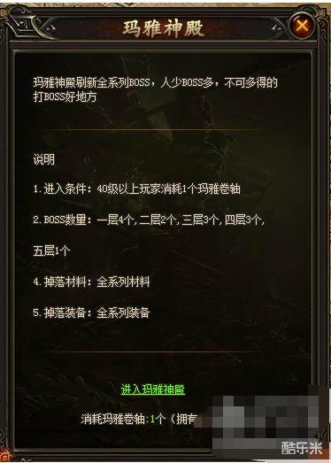 玛雅神殿一共5层,每层都有大量BOSS,击杀后可获得极品装备,是玩家行会争夺资源的首选(玛雅卷轴可在商城购买)