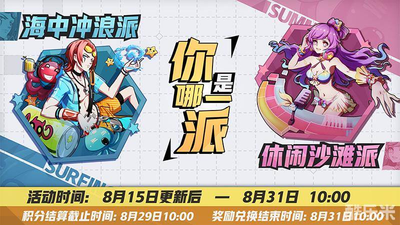 为迎接文曲星、钟馗两位学园男女神的夏日限定泳装,8月15至28日,学园将开启泳装阵营战。文曲星代表的“休闲沙滩派”,和钟馗的“海中冲浪派”,同学们可自由选择一方(选定后不可更改)。此后,只要通过日常战斗,即可为所在阵营累计积分。活动结束时,累计积分更高的阵营将会胜利,胜者获得阵营专属头像框。个人日常战斗累计积分达到不同档位,即可解锁领取不同奖励。在个人获取积分排行榜中排名前10%的同学都可获取阵营的泳装时装,前5%更加送染色喔!