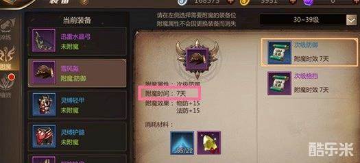 附魔材料拥有不同品质的,附魔材料通过公会守卫战、声望任务、钓鱼、公会历练、战场、竞技场积分奖励等方式可以获得。每个附魔时效都为7天,点击后附魔效果是在相应的装备位置上,附魔越好属性消耗的材料也会越多,相应的附魔材料也可以点击之后可以查看获得方式。