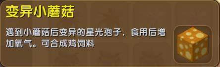 描述:遇到小蘑菇后变异的星光孢子,使用后增加氧气。可合成鸡饲料。