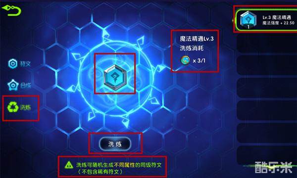 洗炼前注意事项:符文洗炼可以将当前属性的符文重新随机生成,只有LV3符文及LV3以上的符文可以进行洗炼。洗炼符文需要消耗洗炼精华。