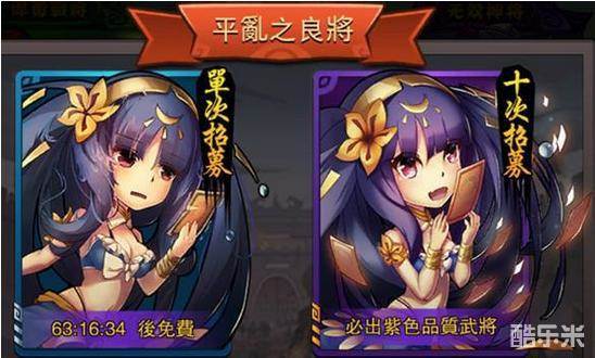 平乱良将需要消耗元宝进行招募,玩家可从此处获得橙色品质武将的武魂和紫色品质的武将,单次招募每次消耗60元宝,若是十连抽则必获得紫色品质的武将。玩家每隔一定时间可以免费获得一次招募平乱良将的机会。