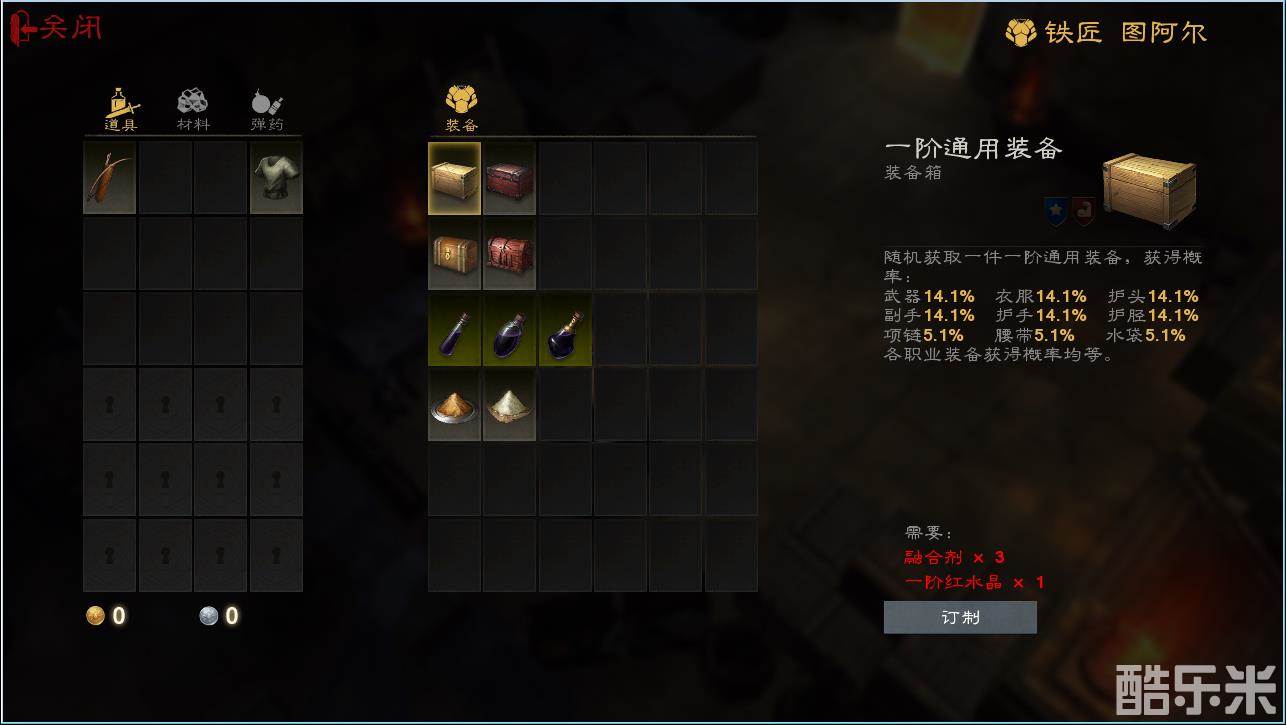 装备盒子通过铁匠订制而成,通用装备需要的物品为红水晶和融合剂,专属装备需要的物品为蓝水晶和活化剂。