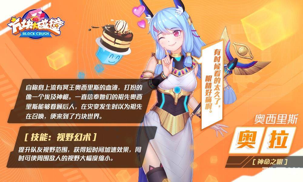 自称身上流有冥王奥西里斯的血液,打扮的像一个埃及神棍。一直信奉她们的祖先奥西里斯能够眷顾后人,在灾变发生时以为祖先在召唤,便来到了方块世界。