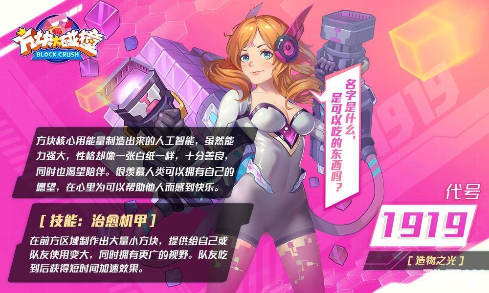 方块核心用能量制造出来的人工智能,虽然能力强大,性格却像一张白纸一样,十分善良,同时也渴望陪伴。很羡慕人类可以拥有自己的愿望,在心里为可以帮助他人而感到快乐。