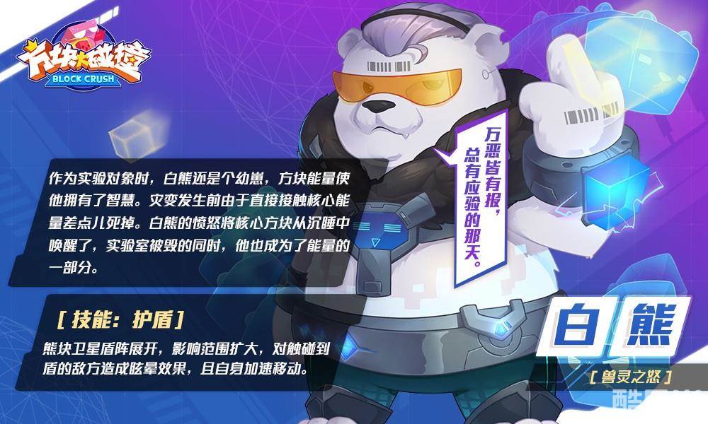 作为实验对象时,白熊还是个幼崽,方块能量使他拥有了智慧。灾变发生前由于直接接触核心能量差点儿死掉。白熊的愤怒将核心方块从沉睡中唤醒了,实验室被毁的同时,他也成为了能量的一部分。
