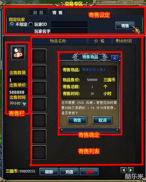 在商城界面的右上角,点击【交易专区】按钮,就可以打开交易界面了,交易界面共分三个版块: