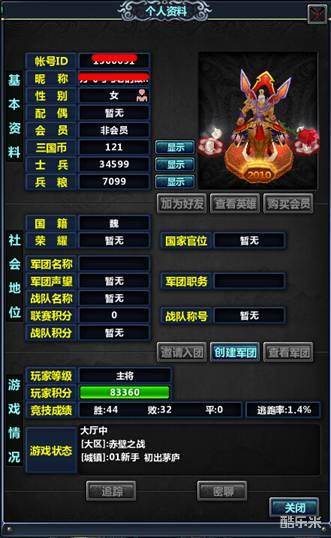 在城镇大厅或房间中,玩家可以点击操作界面上的“资料”按钮,打开自己的角色资料面板: