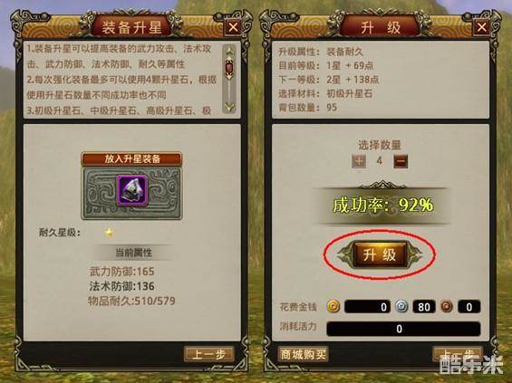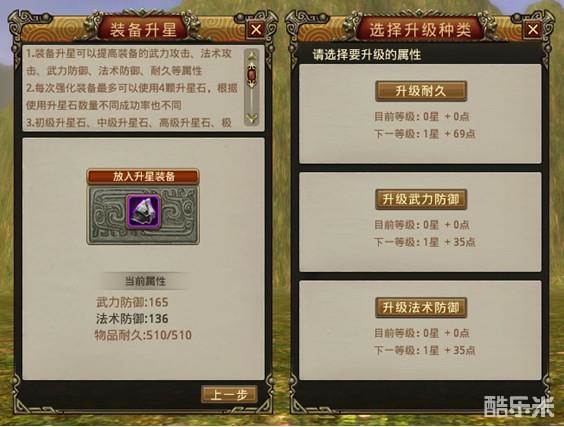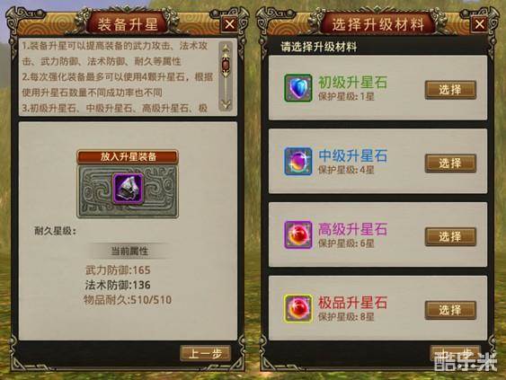 小贴士:只能对武器和防具升星,且武器只能升级攻击、耐久,防具可升级武力防御、法术防御、耐久。