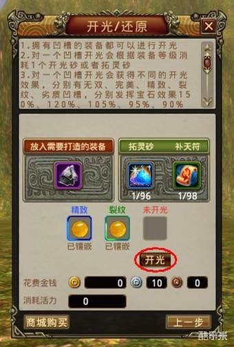 相关道具:有胚槽的装备,开光砂/拓灵砂(分别对应1-49级和50-80级的装备),补天符/复天符(分别对应1-49级和50-80级的装备)。