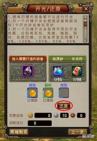 对于不满意品质的凹槽可以用“补天符”进行“还原”。还原后,得到胚槽,可以重新对其开光。