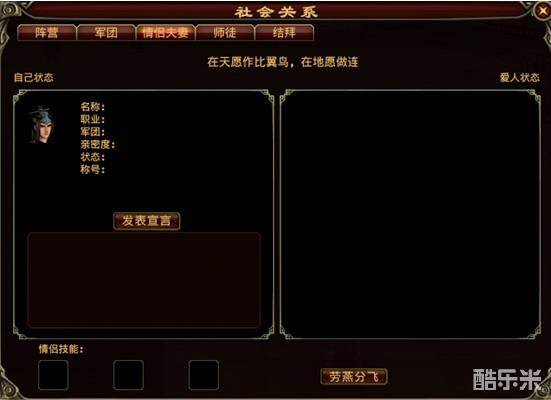 4、情侣关系建立后,情侣双方可发表结拜宣言。点击“发表宣言”可输入宣言。