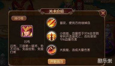 所以打吕布佩带的技能是:岂曰无衣,临机制胜,空元破日。其实这关重要的是保证英雄不死,所以进去后大部分能量应该放在岂曰无衣上,给英雄加血,保证英雄血量不低于百分之三十五,血量都够多的时候可放临机制胜,靠英雄打出更多的伤害。