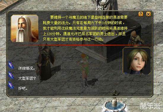 为了消灭这个魔王,大先知哈默(卡诺萨城,138,397)专门创造了一项传送法术,可以将一支除魔的军队送入地下堡垒。但是,亚特王国的大半军队正在与魔族作战,实在抽调不出多余的兵力参与这次行动。无奈之下,大先知哈默只好寄希望于冒险者组成的各个军团,或许,除魔的英雄就将在这些军团中出现。