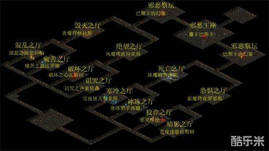 邪恶祭坛:通往邪恶王座的最后一道障碍,杀死100个巴斯卡的随从,你将会激怒魔王,分别消灭两边的魔王幻象,才能打开通往邪恶王座的通道。